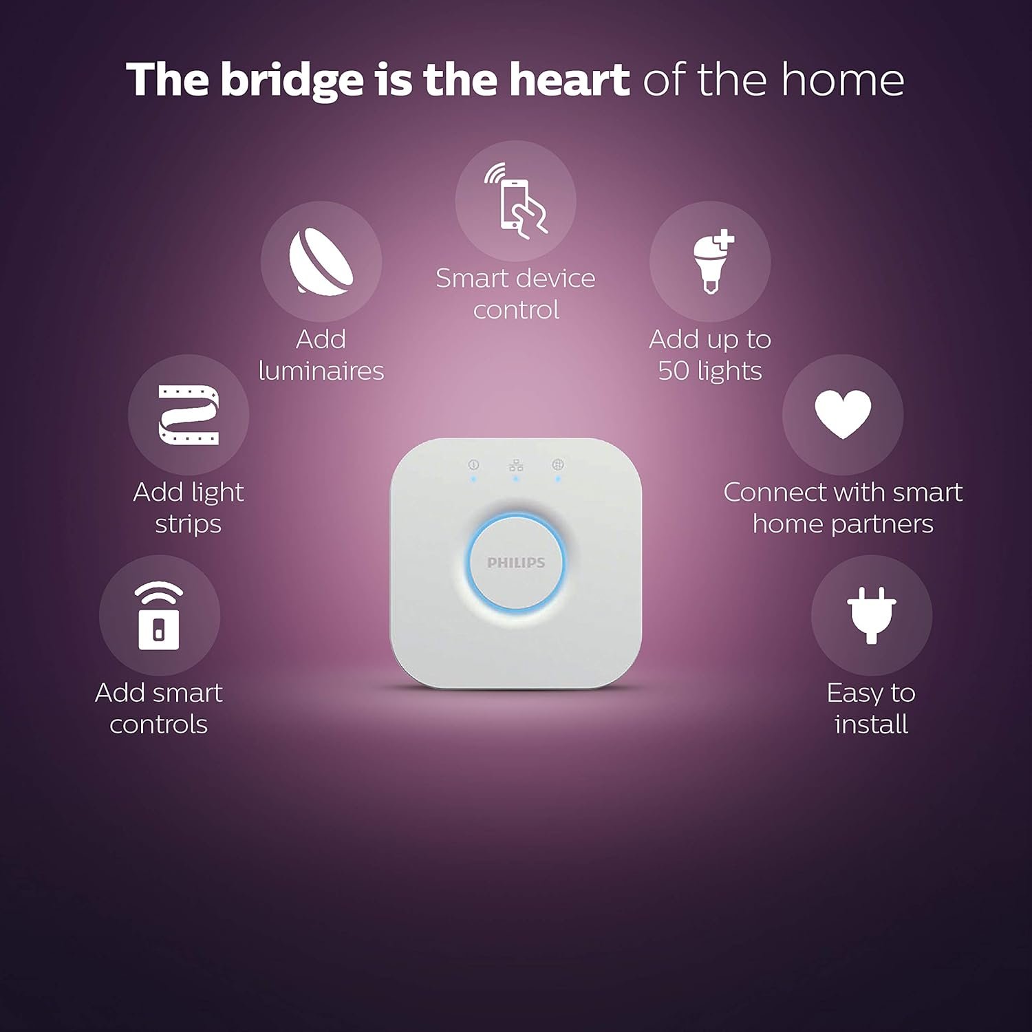 The Philips Hue Bridge is all you need to set up your personal Philips Hue system. This is actually the brain of the operation that enables you to control all of your Philips Hue products via the Philips Hue app. Once you have installed the Philips Hue Bridge and downloaded the Philips Hue app on your smart device, you can set your imagination free and build your very own system! The Philips Hue bridge is compatible with Amazon Alexa, Google Assistant and Apple Home kit technology. Ask Alexa, Google or Siri to turn on or dim your lights or recall presets without touching a single button!